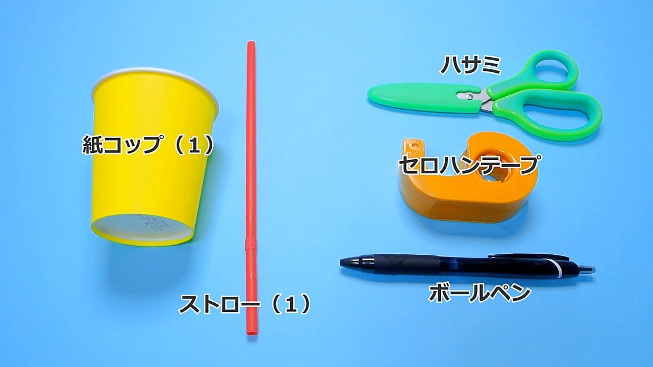紙コップ竹とんぼを作るのに必要な材料と道具は以下のとおり。