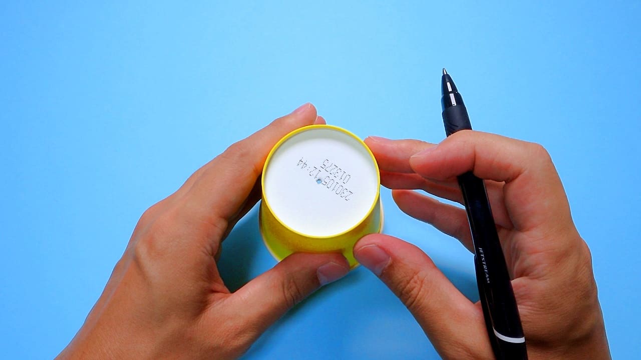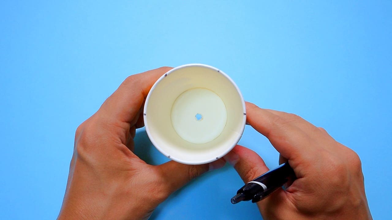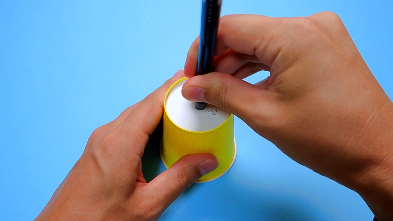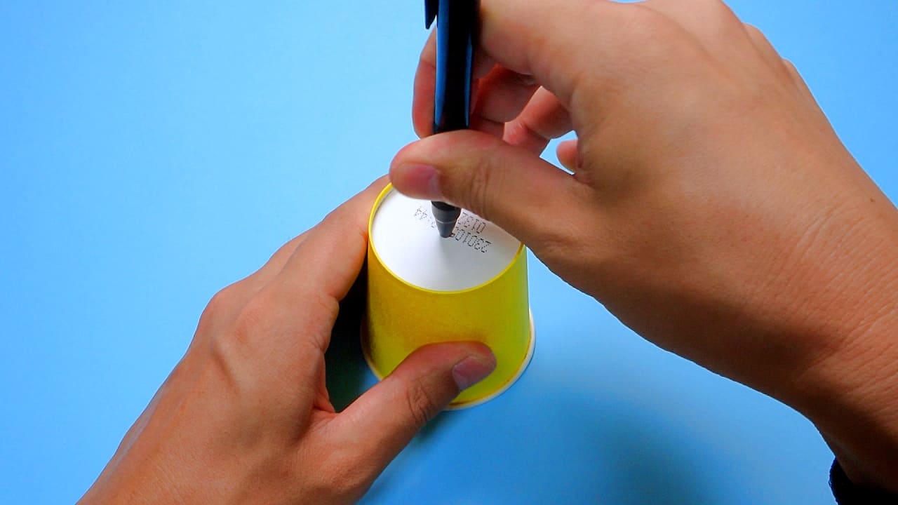 紙コップの中心に、ボールペンで穴をあけます。