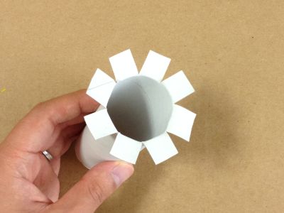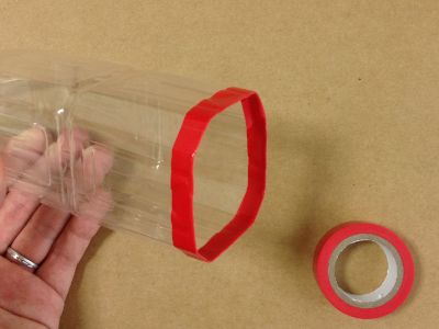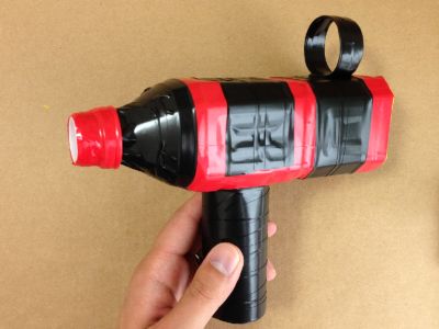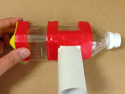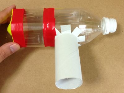 ペットボトルの半分くらいの場所に、トイレットペーパー芯を貼り付けます。これも風船を同じように、何重にもビニールテープを巻いてガッチガチに固定してください。