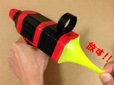 引っ張れば引っ張るほど、空気砲の威力も上がりますが、風船が破けたり、外れてしまったりする可能性があるので、力加減に必要です。
