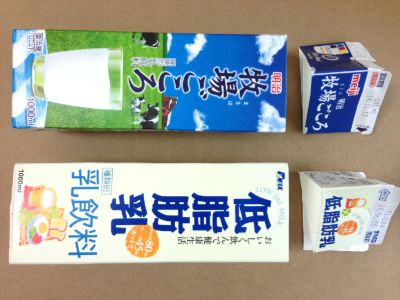 2本の牛乳パックの飲み口部分をハサミでカットします。