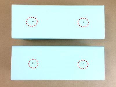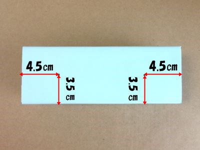 牛乳パックに穴を開けるための目印を付けます。ここでは左右の端から4.5cmで穴を開けていますが、幅は目安なので的にするものの大きさによって適宜変えてください。
