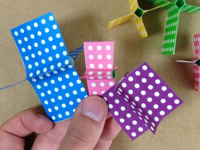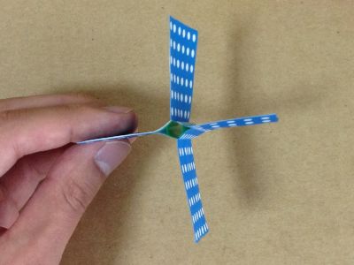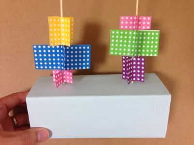 十字にすることで、的に当たったときクルクルと回るようになります。6個くらいでそれぞれの大きさを変えて作りましょう。