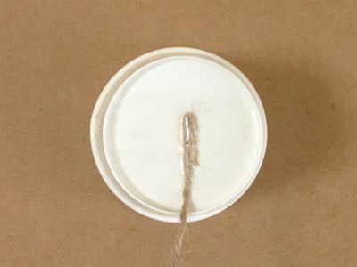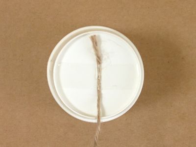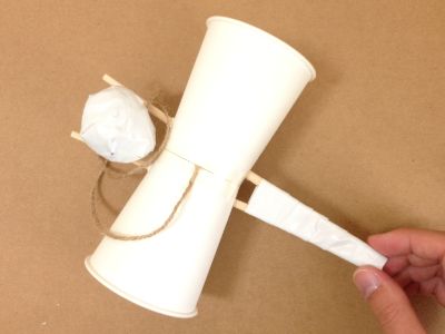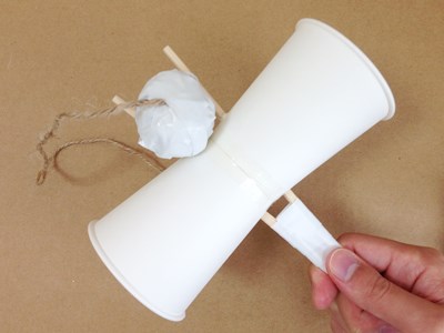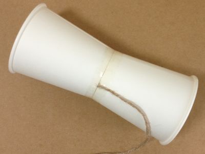 片方の紙コップの底に、ヒモをテープで貼ります。