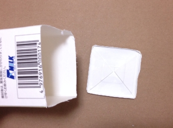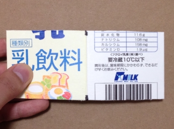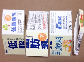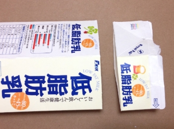 残った牛乳パックを6㎝の幅で切り分けます。下の画像のように3個作れるかと思います。(※端の細く残った部分は使いません)