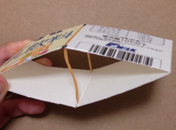 遊び方はとっても簡単。ゴムが水平になるように牛乳パックをつぶして、その指をはなすと「ぴょん」と飛び跳ねます。