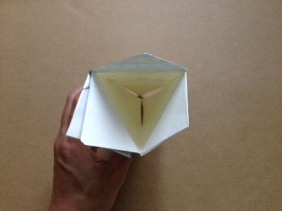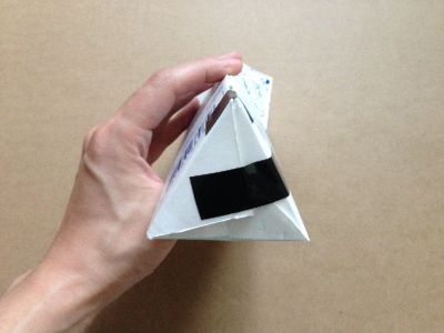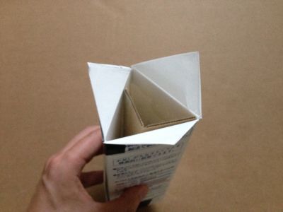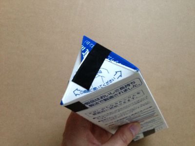 牛乳パックを三角柱になるように折りたたみ、その中にカットした段ボールを入れテープで固定します。