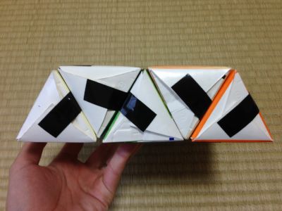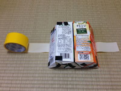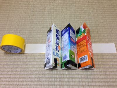 それぞれ分かれている牛乳パックを、布テープでまとめていきます。
