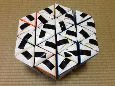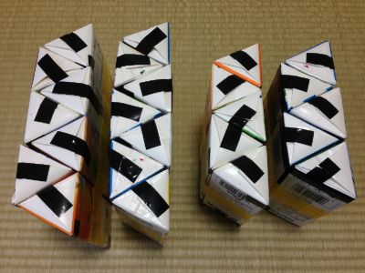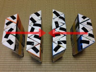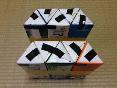 【STEP4】で4ブロックにまとめた牛乳パックを、さらに1つにまとめます。