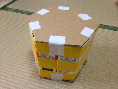 カットした段ボールを、牛乳パックの上下に貼り付けていきます。これで土台は完成です。