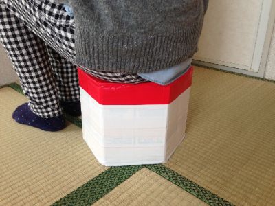 完成した牛乳パックに座ってみましょう。大人が座っても、全然びくともしません!とても頑丈です!