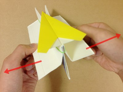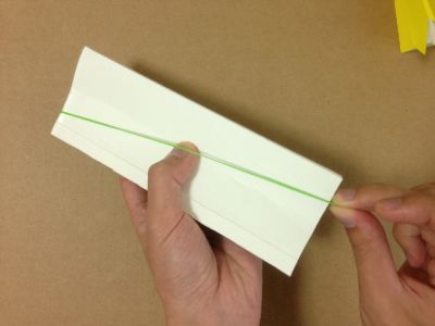 さらに紙飛行機を遠くへ飛ばしたい場合は、ゴムの径を小さくしましょう。小さいゴムなら発射するときに、普通のゴムより力がかかるので、速く遠くに飛ばすことができます。