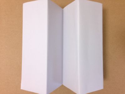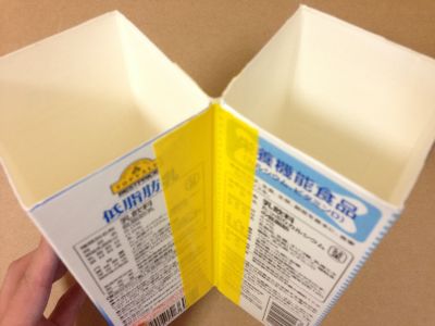 牛乳パックを2つ並べて、真ん中をテープで固定します。さらに、その裏側も固定して、画像のように2本を連結させた状態にしてください。