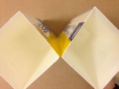 あとは、牛乳パックを閉じた状態と開いた状態で、それぞれ動物やキャラクターの顔を書いたり貼ったりすれば、いないいないばあの完成です。