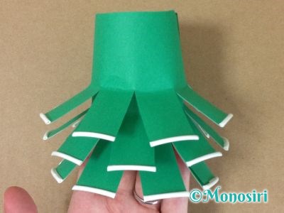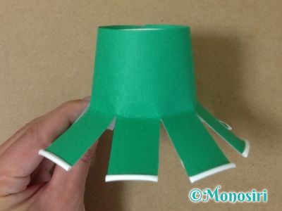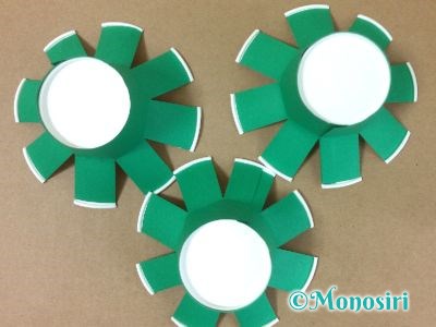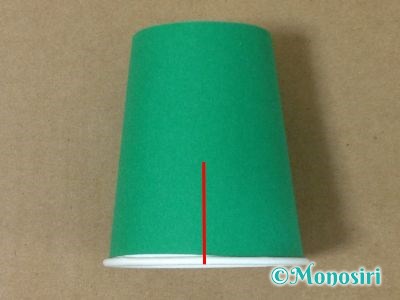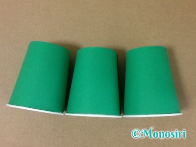 緑の画用紙を切って、紙コップ3個それぞれに貼ります。