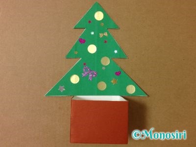 鉢の部分に茶色の画用紙を貼って、ツリー部分はシールなどで飾り付ければ、クリスマスツリー型小物入れの完成です。