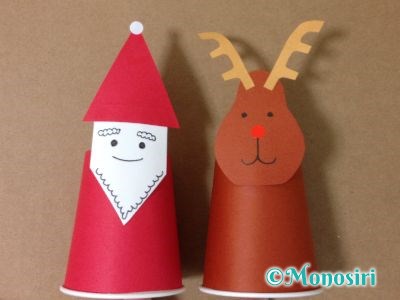 顔を紙コップに貼り付ければ、サンタクロースとトナカイは完成です。